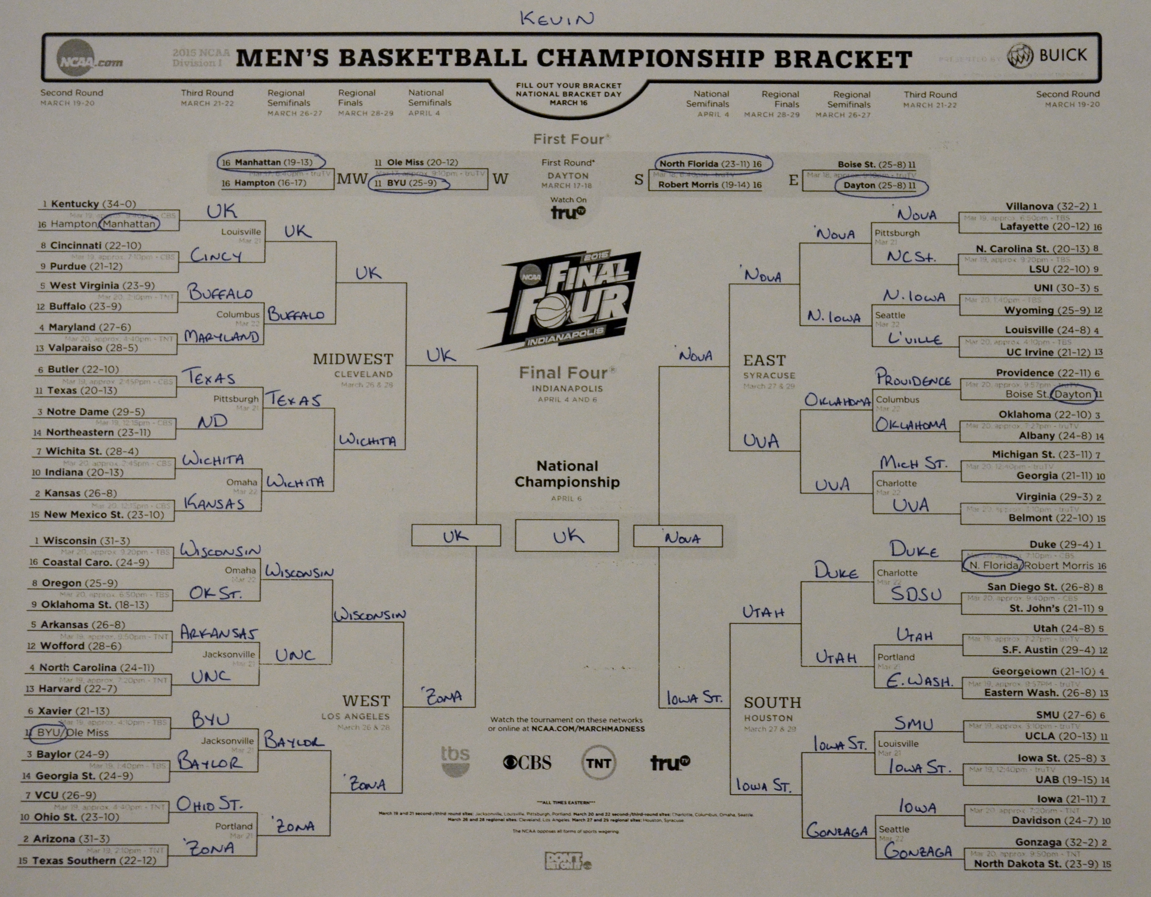 John Templon: Kentucky, Wisconsin, Northern Iowa, Duke, in the Final Four, Kentucky as champion – Full Bracket (PDF); I picked an NIT bracket too, that has UCONN winning.